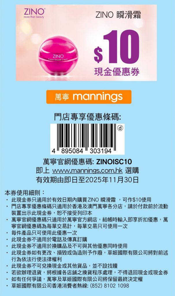 【ZINO 瞬滑霜】萬寧網店尊享優惠碼:ZINOISC10