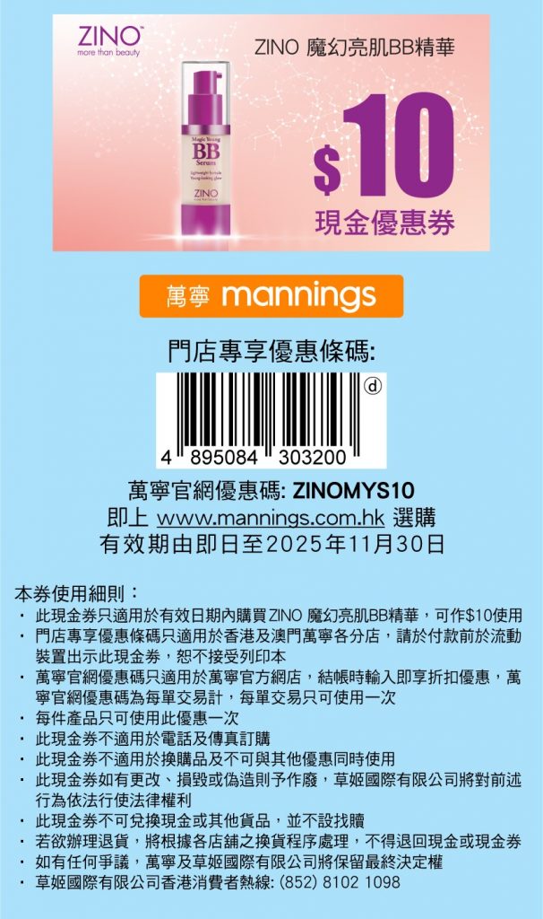 【ZINO魔幻亮肌BB精華 30毫升】萬寧網店尊享優惠碼:ZINOMYS10