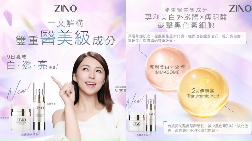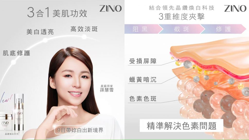 而「ZINO晶鑽煥白系列」 的理念是:美白, 同時修復。肌底健康了,美白成分才能真正發揮作用,且不會產生過敏或反黑現象。
