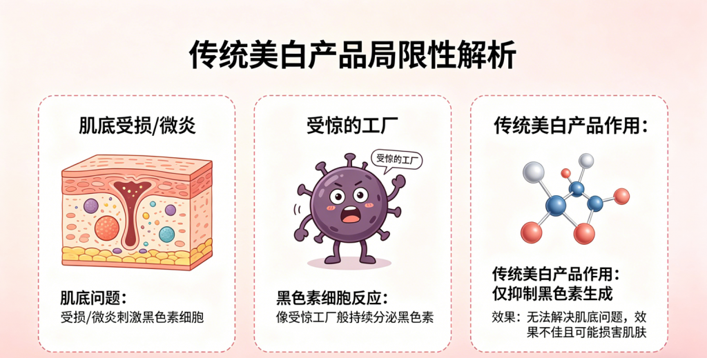 而傳統美白產品往往只注重抑制黑色素生成,但如果肌膚底層受損、有微炎情況,黑色素細胞就會像「受驚的工廠」不斷分泌黑色素,無法根源解決色素問題,此時用這類美白產品不僅效果不佳還有可能損害肌膚。